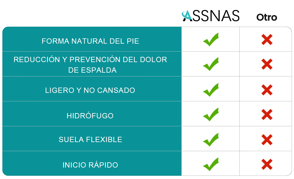 Ya sea para dar un paseo, ir de compras o para una jornada de trabajo, con ASSNAS caminar dejará de ser una carga. ¿El resultado? Más energía, más vitalidad y una mejor figura, paso a paso.