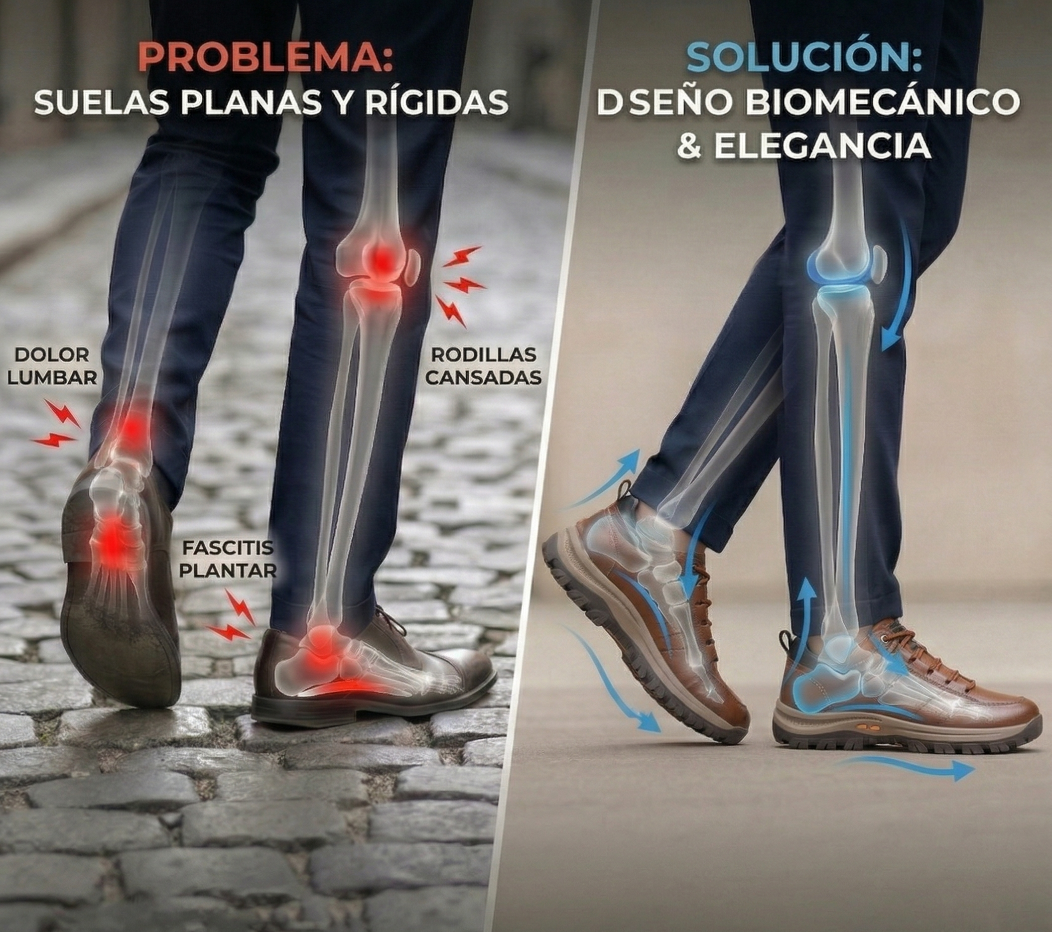 Y, sin embargo, para millones de personas, un simple paseo por los adoquines o una larga jornada de trabajo de pie se transforma rápidamente en una pesadilla: dolores lumbares, fascitis plantar y rodillas fatigadas.