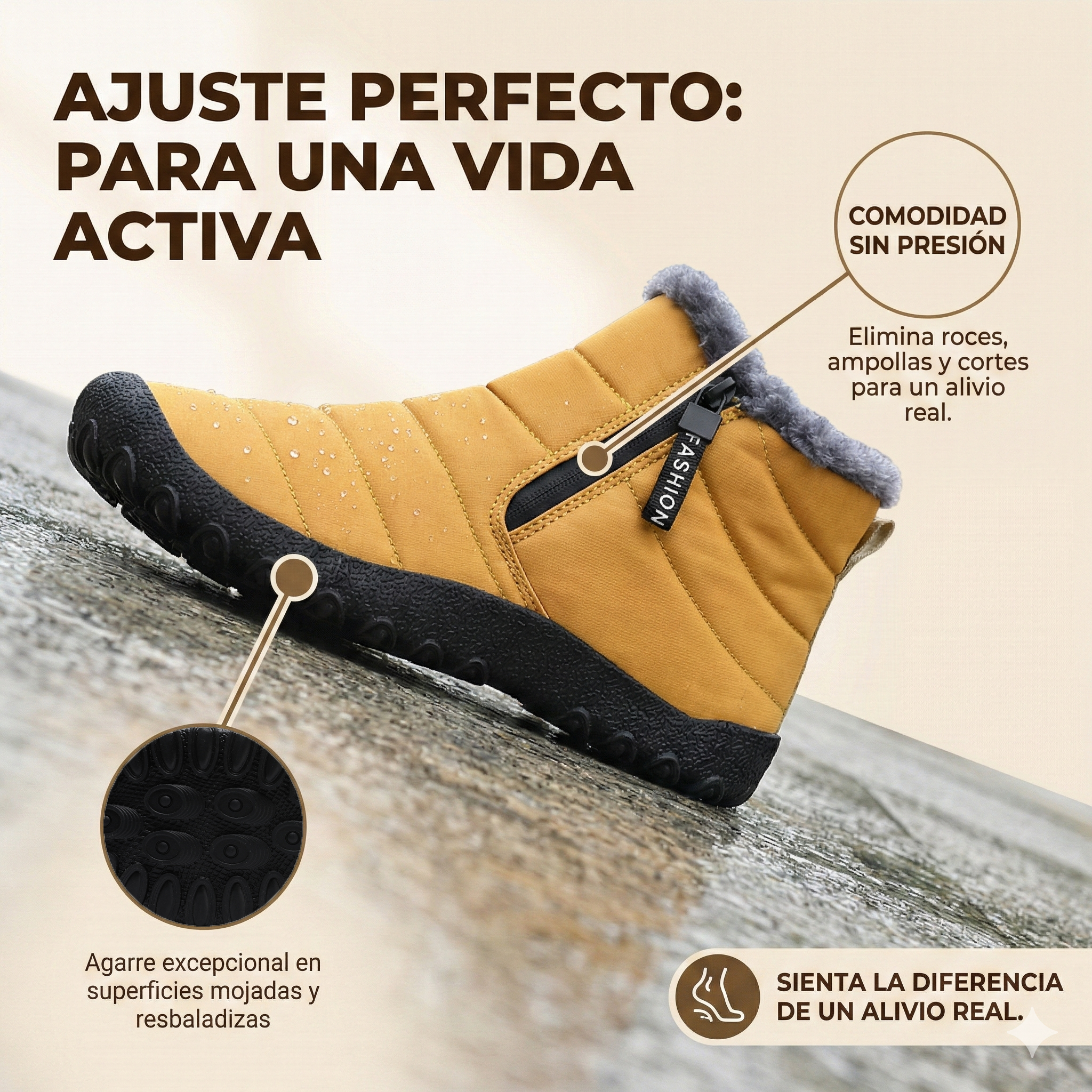Cuando el camino resbala, nuestra suela antideslizante con dibujo profundo te da el agarre que necesitas. Sentirás una estabilidad total en cada paso.